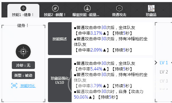 健身是被动技能,一旦普攻命中在达到30次之后就可以有效提升全体队友3.17%的命中率,并且还会持续5秒的时间。这一个技能在面对闪避率比较高的敌人时,就可以有效增加团队的输出能力。唤醒是第2个被动技能,在全爆裂时间开始时就会触发。在持续10秒的时间内就可以有效提升全体队友19.49%的暴击伤害。