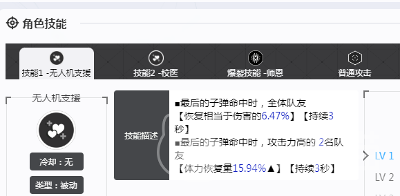 在技能方面,无人机支援就是主要的核心被动技能。如果最后一颗子弹直接命中目标,那么全体队友全部都可以恢复一定比例的生命值,并且在持续三秒内都有效果。技能等级在提升之后,无论是恢复的比例还是提升的幅度,都会有明显的增加。最后全体队友的恢复就等同于是伤害数值的10.95%。攻击力比较高的两名队友就能有效提升26.98%的几率。