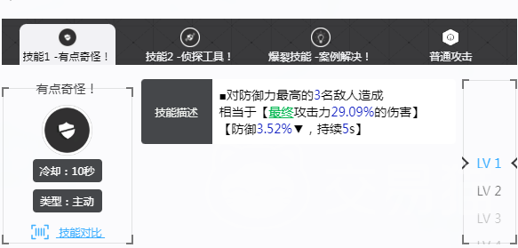 在技能方面会拥有独特的防御能力。有点奇怪是主动技能,有10秒的冷却时间,对于防御力最高的三名敌人就可以造成26.18%的伤害,而且还会降低3.52%的防御力。侦探工具属于被动技能,一旦普通攻击命中100次就能够获得政务收集的效果,然后提升6.75%的防御力,并且还可以叠加5次。
