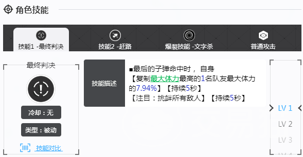 最终判决这就属于一个实用性的技能,一旦最后一颗子弹在命中时,那么就可以直接复制体力最高队友的体力的其中一部分,而且在持续5秒的时间内都有效果。这一个技能也就意味着在战斗的过程中就可以尽情地吸引敌人的火力,而且还会拥有较好的生存保障,此时就可以带来较好的辅助优势。
