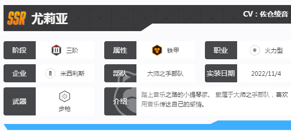 从外观就可以看出,尤莉亚聚会还是比较精致迷人的,会拥有着优雅的服饰,而且战斗的姿态也比较坚定,眼神中会有一种无谓的光芒。将音乐家的气质紧密的融合展示的应有,让大家都会喜欢上这一个角色。