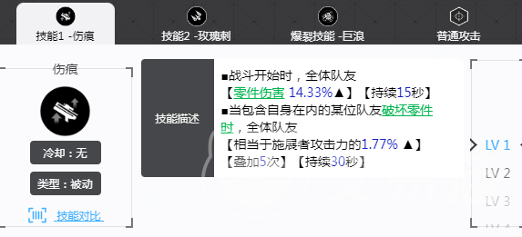 伤痕技能是比较实用的,在战斗开始时全队队友零件伤害都可以提升14.33%,而且还会持续15秒的时间。如果有队友破坏零件时,那么全体队友都会额外的获得增益比例,并且可以叠加。因此整体的实用性在这里可以得到提升。