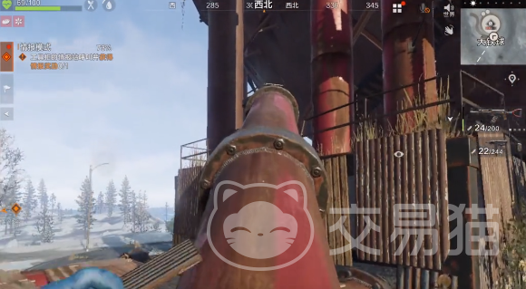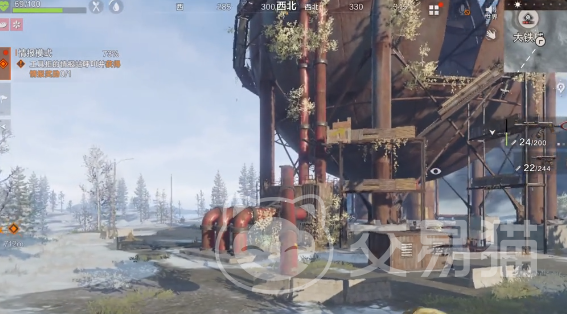 如果没有攀爬基础的玩家,就可以从刚刚翻过去的位置,然后重新的翻回去。一旦在抵达大铁球上面之后就可以看到有三个箱子,不过边上还会有守护的 Npc,不过为了可以顺利的获取物资,就需要尽快的解决掉。在获取完物资之后就可以原路返回,当然别以为这就结束了,在大铁球的下面还会有燃油油桶以及炼油机等等。