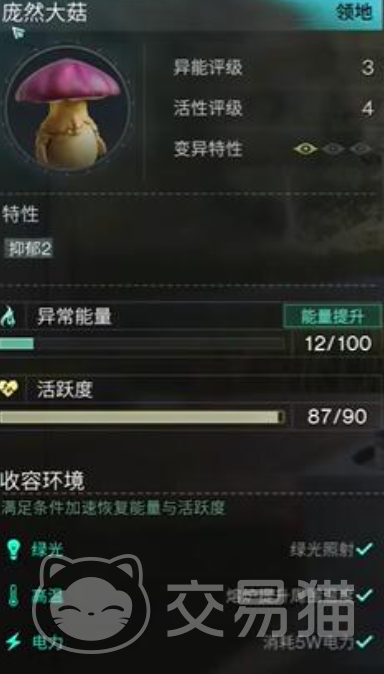 玩家获得庞然大菇之后,需要将庞然大菇直接放到收容仓当中,还需要给它提供绿色的光照和高温环境,才能够让它异能。当它的异能达到30点,庞然大菇将会进入到工作状态。