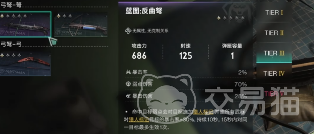 首先登场的是反曲弩,虽然它只是紫装,但它的表现完全不输那些高贵金装。别小看它那看起来平平无奇的身板,实则暗藏杀机。攻击力高达279,射速也不拖后腿,更妙的是它自带的标记机制,命中时有超过一半的概率在敌人身上打上标签。这可不是好看用的,一旦成功标记,后续攻击就能直接增伤,足足维持一分钟,操作空间非常大。