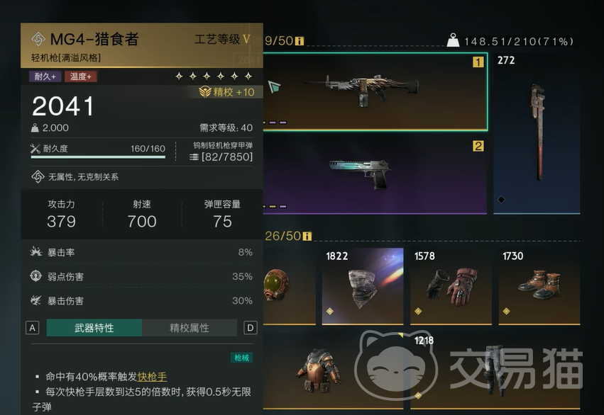 轻机枪“猎食者”不靠一发定江山,它靠的是子弹风暴一般的压制力。虽然单发伤害平平,但它的射速高达700发每分钟,再加上夸张的75发大弹匣,实打实的火力压制利器。一旦架好枪线,对手基本别想抬头,看着子弹铺天盖地地扫过去,就算是Boss也得先考虑跑路。