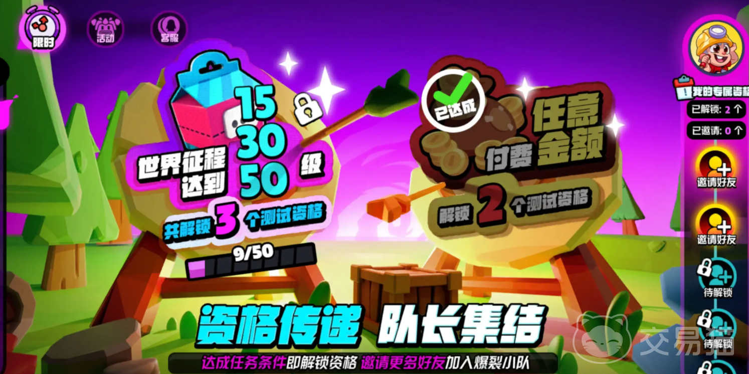 值得一提的是,当玩家在游玩期间,完成了等级挑战任务,还能够解锁更多的测试资格,用于发放给其他的好友,进入到爆裂小队之中,一起开启冒险。