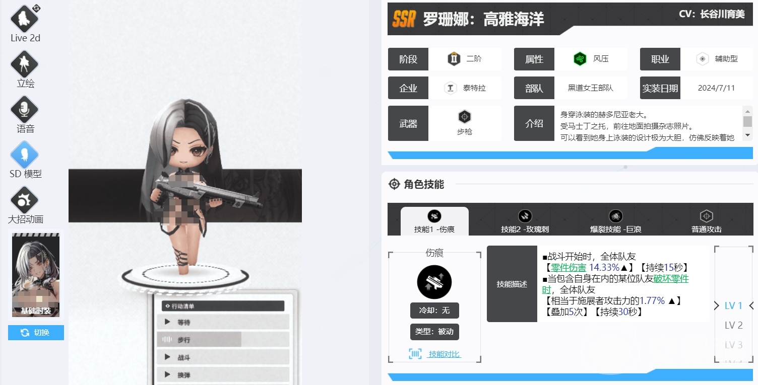 罗珊娜高雅海洋有着SSR的稀有度,属性为风压,职业定位是辅助型,由泰特拉企业打造,隶属于黑道女王部队。她使用的武器是步枪,而她的身份也颇为特别——身为赫多尼亚老大,受马士丁之托前往地面拍摄杂志照片,身上泳装,仿佛也映射着她独特的性格。
