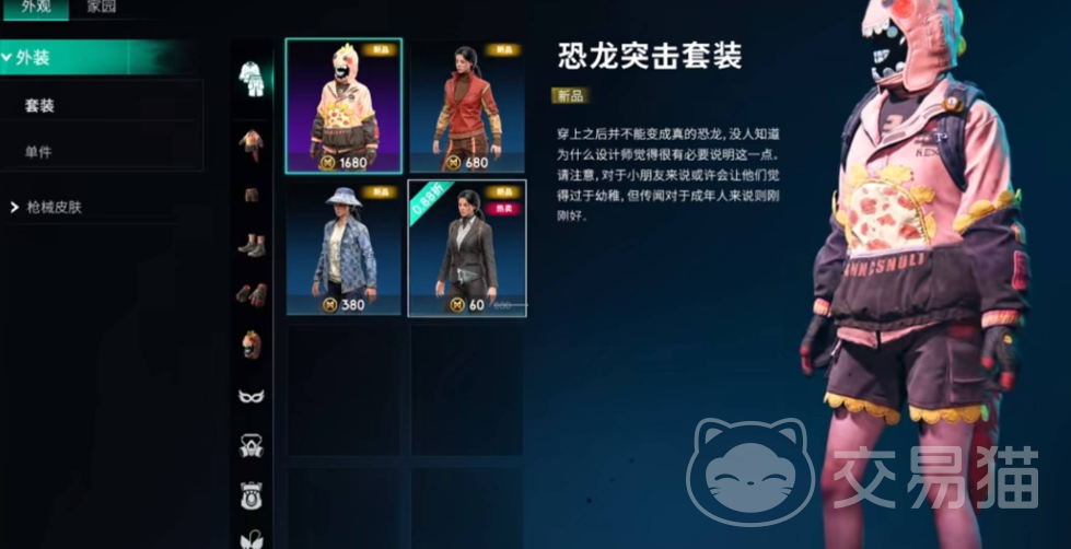 首先第一个时装就是恐龙套装,作为168元的价格还是非常高的,之后也会有一些六元的商品,包括帽子,挂件和背包等等,整个时装整体还是非常完整有趣的,穿上身之后,对于小朋友们来说,会更加的具有童年趣味性。