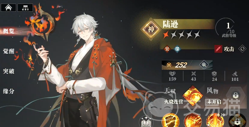 火烧是走法伤体系,2个核心输出周瑜和陆逊肯定是不能少的,周瑜看中的实他的绝技可以全体附加灼烧,配合上天赋提升友方造成的灼烧,简单说就是挂灼烧和增伤。后期转职可以考虑转谋士,在战斗开始的时候全体5%的法术增伤以及下一位队友的20%单次增伤。