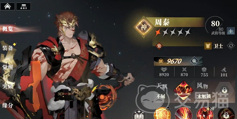 第四个武将人选用“周泰”,他的天赋可以给到队友强有力的保护,可以根据敌人的情况来切换不同的职业。周泰的绝技可以获得高额免伤并且护卫效果,护卫是可以在身后2排武将受到伤害的时候为其分摊部分,手动调整一下站位即可。