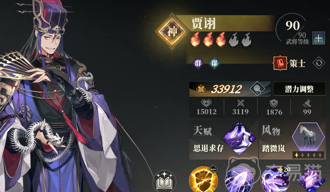 贾诩是队伍的毒伤核心,具备优异的反击与持续输出能力。特别是在三星之后,通过突破天赋可显著提高生存能力与反击概率,推荐优先养成。其技能大多为排面AOE,尤其适用于PVE副本中常见的直线站位敌人。