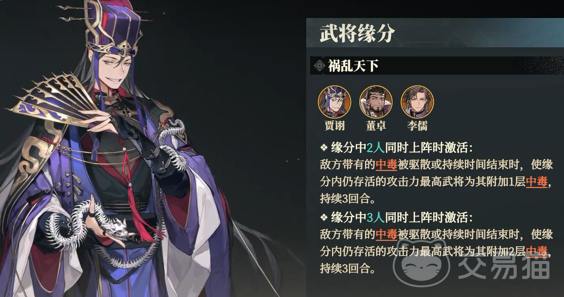 董卓则扮演着多功能打手与体系支点的角色。他的绝技具备全体驱散与百分比生命扣除效果,可针对高耐久敌人打出稳定且难以规避的真实伤害;同时,其技能亦带火属性附加,形成与贾诩毒伤并存的双状态压制。