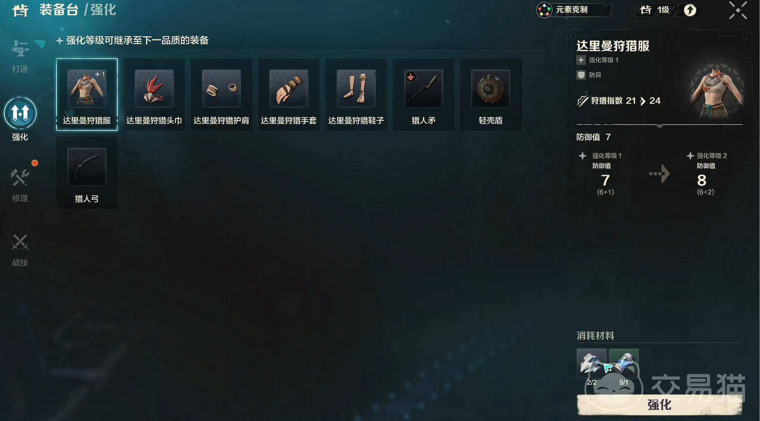 当然如果你想让自己的装备实力更上一层楼的话,那就可以选择强化,接着点击某个装备,之后就会点出强化选项。这时会显示当前需要花费的材料,将其一一装备好之后就可开始强化。例如一件上衣强化之后,就可以提升防御值以及狩猎指数。