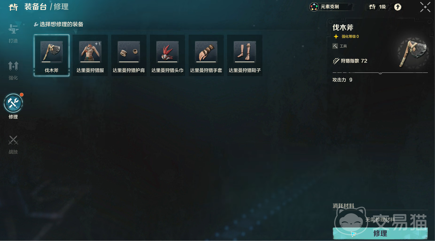 进去修理之后,大家会发现上面有很多的装备,这些装备都是需要修理。如果耐久度没有损耗的装备,是不会出现在这里的,所以大家如果有要用的装备,就可以随手全部修理了。这里以伐木斧头为例,由于这把工具的等级、品质较低,所以无需耗费修理材料就可进行修理了。