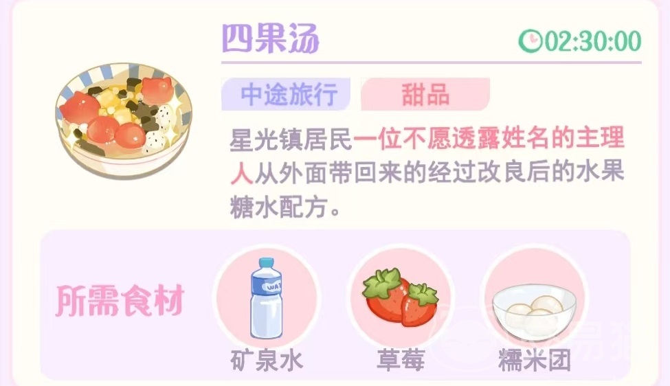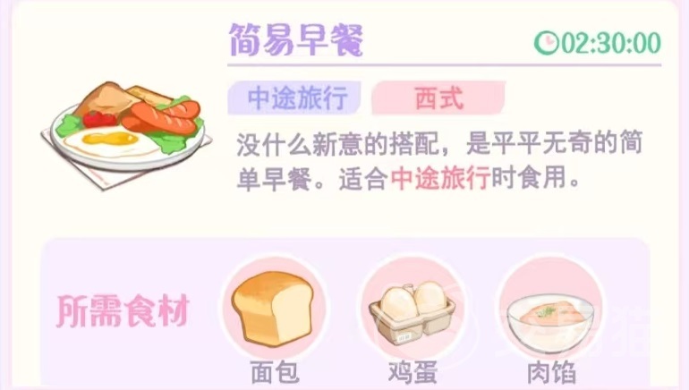游戏中一共出现了三个角色,分别是Paki、Peacoo和Uno,这三个小伙伴都有自己的偏好,在准备的时候一定要看清楚先。来看一下paki,他所喜欢的是甜品类,如果要想中途旅行,那么需要准备的烹饪包括四果汤、芝士夹心麻薯、莓莓夹心瑞士卷、鲜果蛋奶烤布丁、奶油莓果贝果三明治等。