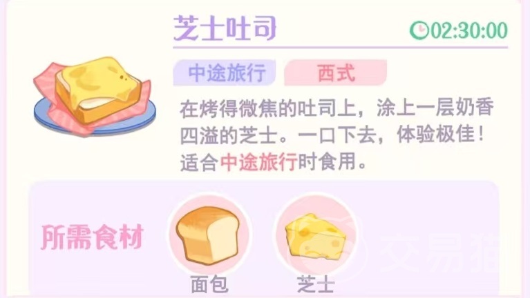 最后一个Uno,在中途旅行上,他所喜欢的是芝士夹心麻薯、培根蔬菜千层卷、烟熏三文鱼贝果三明治。芝士夹心麻薯需要糯米团和芝士进行制作,培根蔬菜千层卷需要的是猪肉、芝士和白菜,烟熏三文鱼贝果三明治需要的是三文鱼和贝果。
