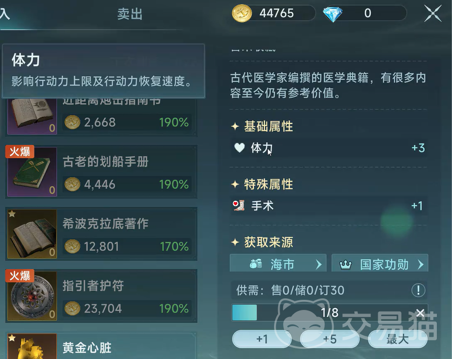 通常建议萌新玩家们可以先看看海市中的装备,透过海市可以看到各种装备的设计图纸,其中有很多宝物饰品可以增加体力值。体力值在前期游戏中尤为重要,可以用来航海冒险,又可以拿来制作各种物品,让大家的贸易之旅可以更加亨通。