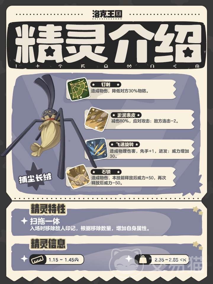 玩家们可以先不断的提升他的等级,等等级达到之后就可以来进化成食尘短绒,作为一个地系和虫系双属性的宠物,玩家们在对战的过程中可以更加具有优势,拥有多种特性,可以来对抗不同的敌人,无论是电系还是毒系或者石系,火系都有明显的克制效果,后续玩家们还可以进化成捕尘长绒,可以来实用灰尘进行清洁,他的种族值也是非常高的。