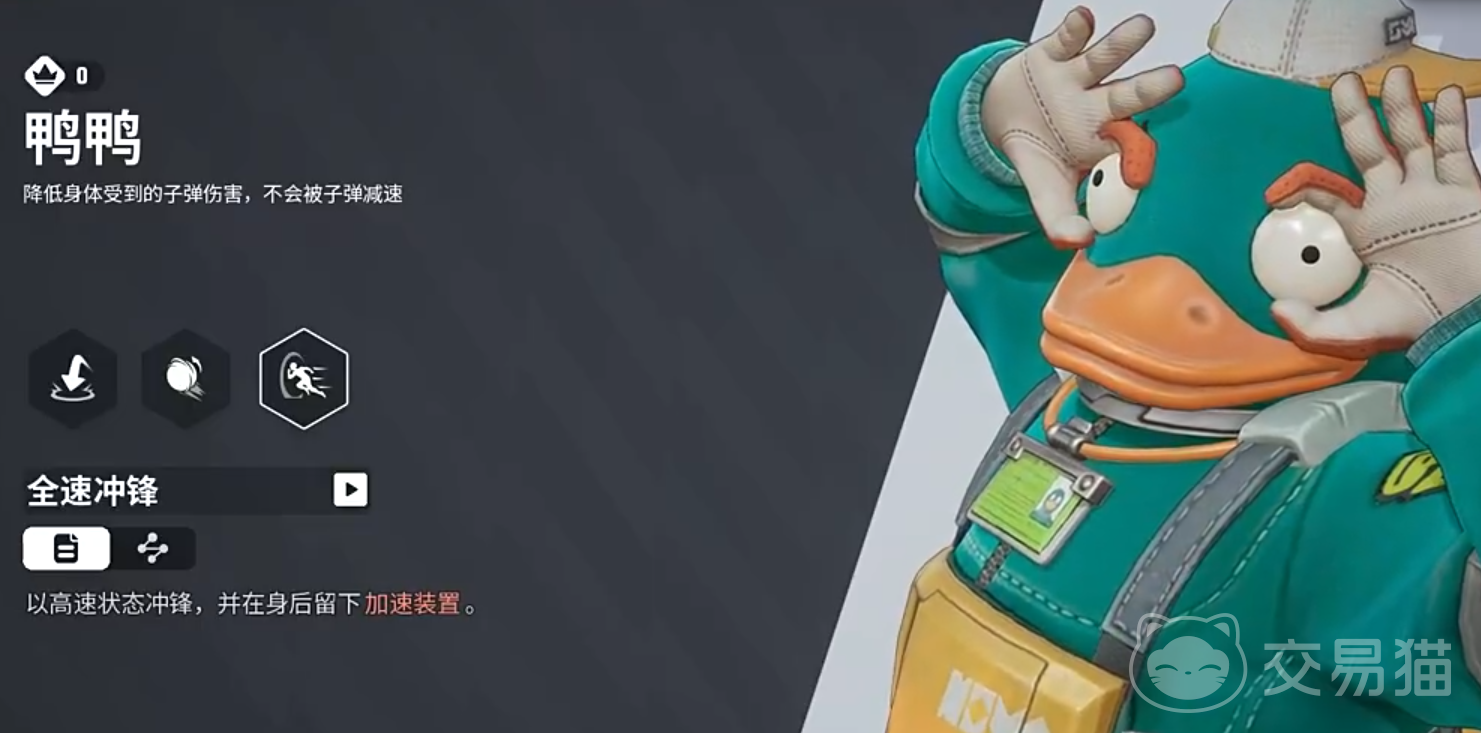 鸭鸭有很强的机动性,能帮助我方突破敌方防线,他的技能一会让自身充气,变成球的形状在地上快速滚动,滚动期间能减少遭受的伤害,还能对接触到的敌人造成输出和击飞,不过累积一定伤害,会强制退出滚动状态,他的技能二会让自身速度变快并进行冲锋,冲锋时候会在后方留下加速装置,其他角色碰触到加速装置也能提升速度,他的绝招会向着前方跳跃,随后砸击下面的敌人,在砸击时除了伤害还会产生冲击波,让内圈范围敌人被击飞,外圈被减速。