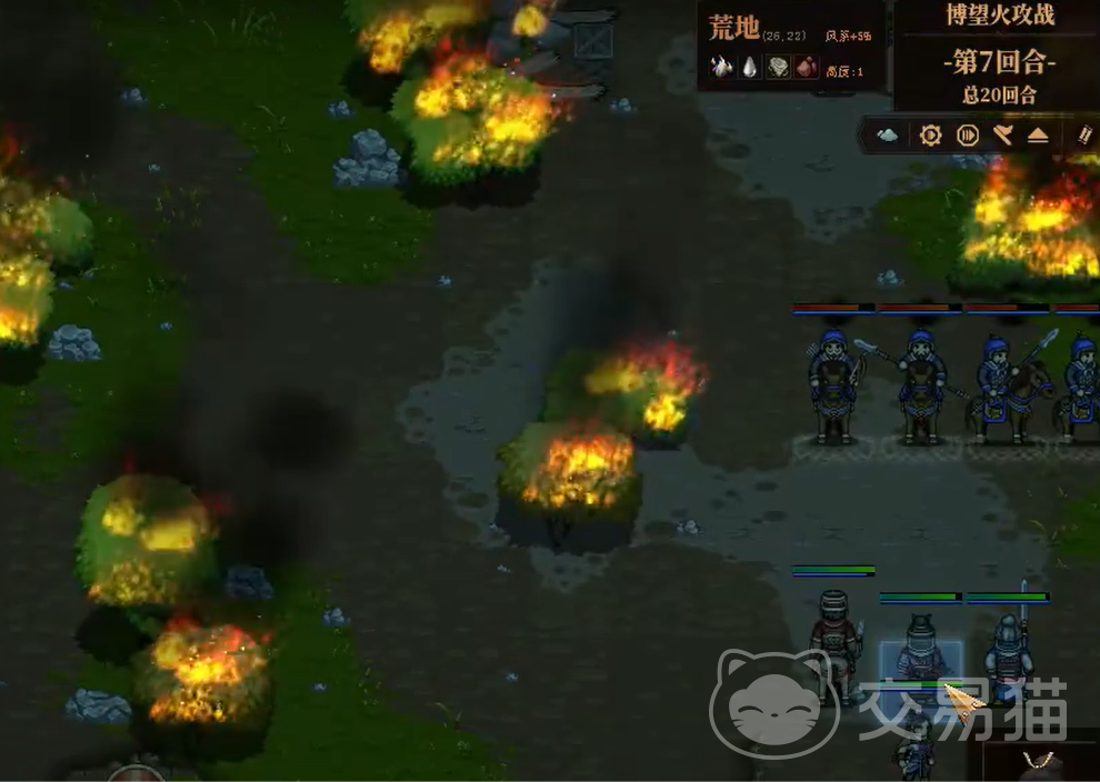 第三回合的话还是一样,直接诱军深入,到了后面就可以看到应援的友军。这时大家就不再是孤立无援,可以使用角色进行擂鼓,接着友军就会射火箭至周围的草丛中。这样其他敌人就会被这些火焰熏得头晕转向,然后再乘机发动其他角色开启进攻。