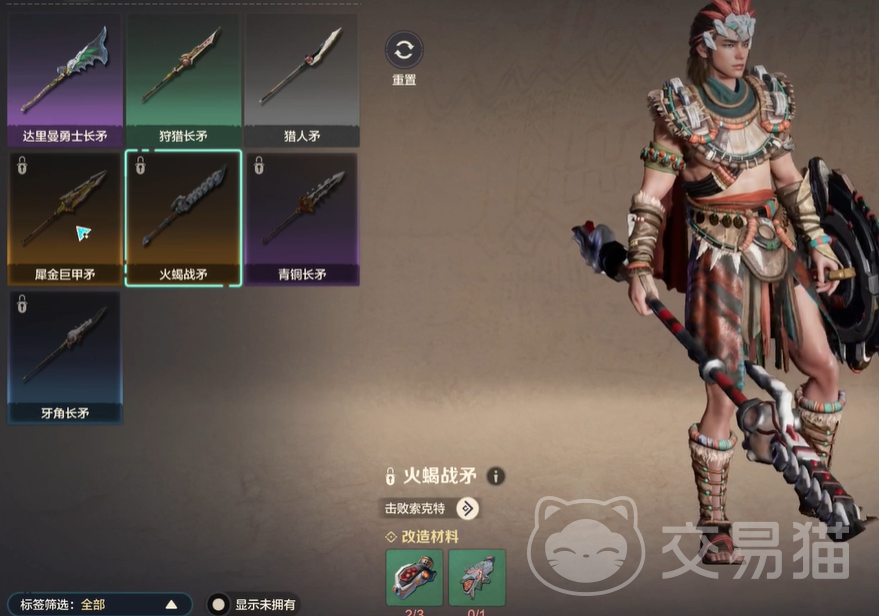 比如说火蝎战矛这个武器,它的获取条件是需要击杀索科特boss才能进行解锁,解锁以后才可以使用对应的材料打造装备,而这样的boss装备是占大多数的,所以获取这类衣服就需要玩家们多去世界内进行征服探索,击杀高级boss就能解锁漂亮的时装。