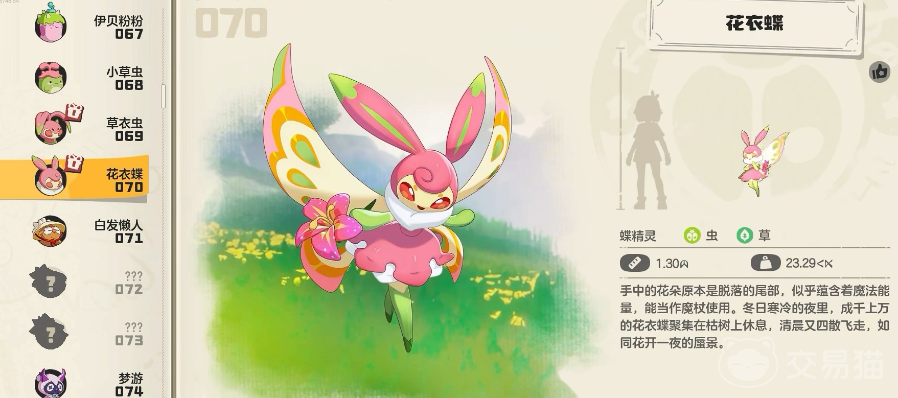 推荐二:花衣蝶,这是草系+飞行系的双属性宠物,它在未完成进化的时候都是充当队伍中的辅助角色,主要为对方施加负面状态。进化后的它战斗力会大大提升,一跃成为主要的输出精灵,再加上花衣碟本身的高敏捷度,能够躲避敌方攻击,同时又给对方造成沉重一击,从而将其击败。其实在打BOSS的时候,还可以让花衣碟凭借【光合作用】这一技能来全队恢复能量值,提高队伍的生存能力。