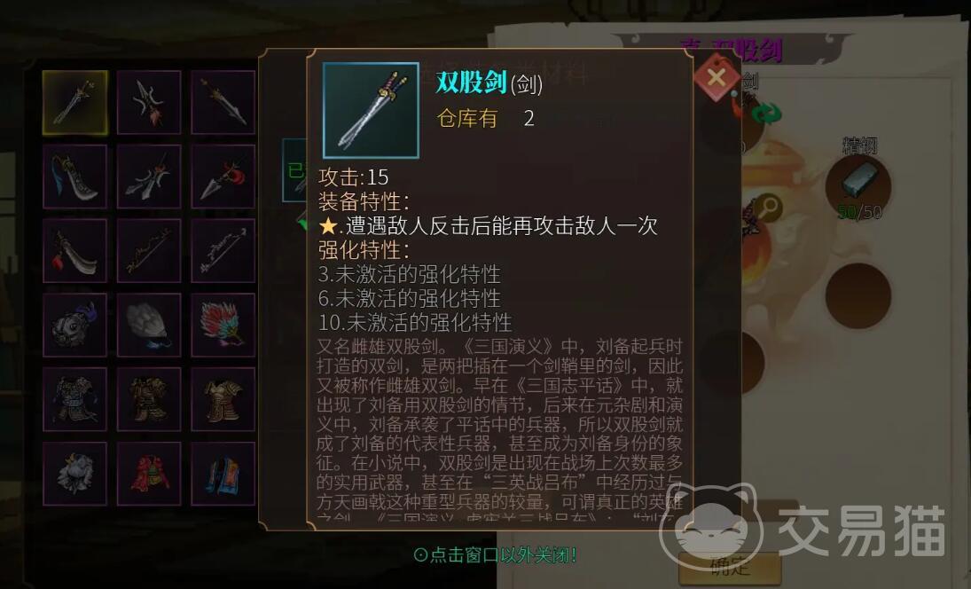 主力输出型武将需优先匹配专属武器。关羽转职后,装备青龙偃月刀可激活暴击伤害+15%”的锻造特性,配合刘备的群体暴击增益,能在BOSS战中实现单回合爆发,当然也可以装备类似双股剑这种非常不错的特殊装备,装备之后能在反击中额外攻击一次,可以说是战坦都非常不错的匹配装备。