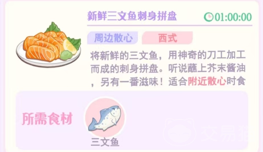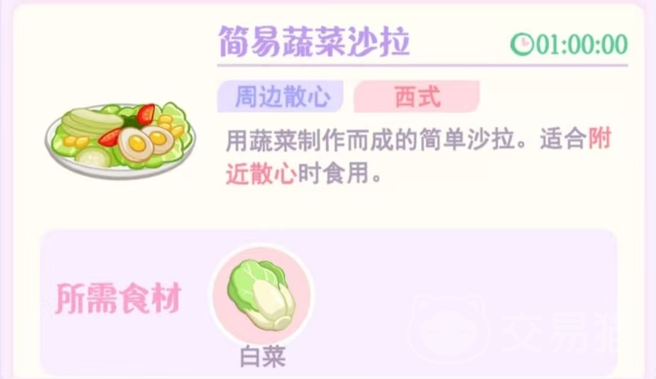 对Peacoo来说,他喜欢的是西式类美食,在周边散心方面,主要包括简易蔬菜沙拉、健康的白人饭、蔬菜沙拉卷饼、新鲜三文鱼刺身拼盘等。简易蔬菜沙拉,用的是白菜这一种材料就能制作出来,健康的白人饭,需要的食材是鸡蛋和白菜。蔬菜沙拉卷饼需要的食材是饼皮和白菜,新鲜三文鱼刺身拼盘需要的是三文鱼。最后是比较喜欢新奇烹饪的Uno,在周边散心方面,他比较喜欢的美食是糯米参鸡汤和日式团子这两个。糯米参鸡汤所需要的食材是糯米和鸡腿,日式团子所需要的食材是糯米团。