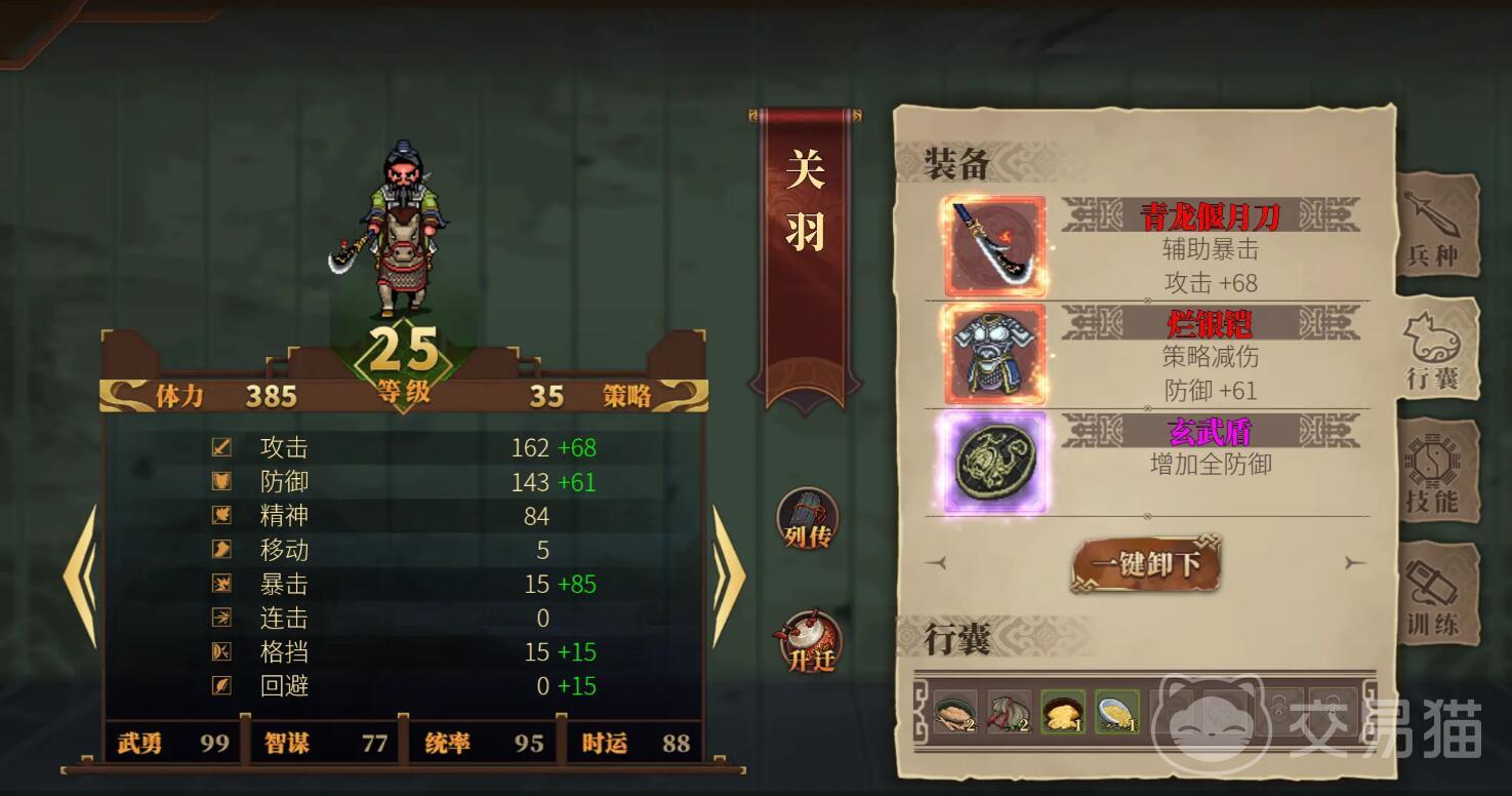 武器锻造需与加点策略联动。关羽的青龙刀优先强化暴击伤害词条(每级+5%),配合时运属性形成双重暴击增益。张飞的玄铁盾附加格挡率(最高+22%),弥补统率未达标的防御缺口。刘备作为团队核心,装备商店铁剑与护甲时,统率需维持70点确保基础防御,剩余属性点投入策略值至40点上限,保障鼓舞技能释放频率。这样才能和关羽一起打出暴击收益。