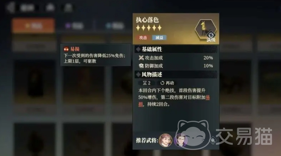 下面小编再给大家推荐几个比较好用且效果不错的风物吧,先来说说这执心落色,它能够直接带来20%的攻击加成以及10%的防御加成,让武将在输出的同时也能有一定的防御能力,而且在本回合内,当下个绝技释放时,其首段伤害能够提升50%呢,增强了绝技的爆发力,不仅如此第二段伤害还会对目标附加易伤效果,持续2回合,这使得敌人在后续受到攻击时,会受到更多的伤害,简直就是为输出型武将量身打造的强力风物。