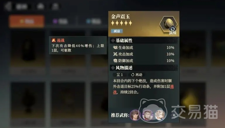 还有金声震玉,它给武将带来的可是全面的属性提升,生命加成10%,攻击加成10%,防御加成10%,而且在本回合内的下个绝技造成伤害时,还能额外击退目标25%的行动条,并且附加1层遇战,持续2回合。