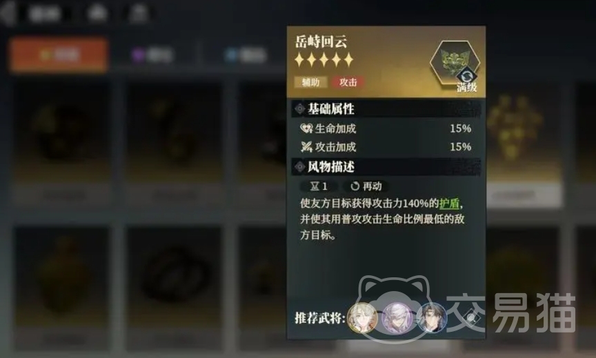 最后就是岳峙回云,它能给武将带来15%的生命加成以及15%的攻击加成,同时它还可以使友方目标获得攻击力140%的护盾,并且能让友方用普攻攻击生命比例最低的敌方目标。