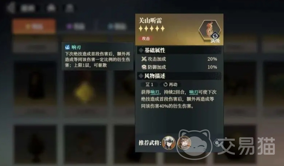 再看看关山听雷,除了具备基础的加成百分比之外,它还有一个独特的效果,那就是可以让武将获得响刃,并且这个响刃效果能够持续2回合,一旦拥有了响刃,在下次绝技造成首段伤害之后,就能够额外再造成等同该伤害40%的衍生伤害。
