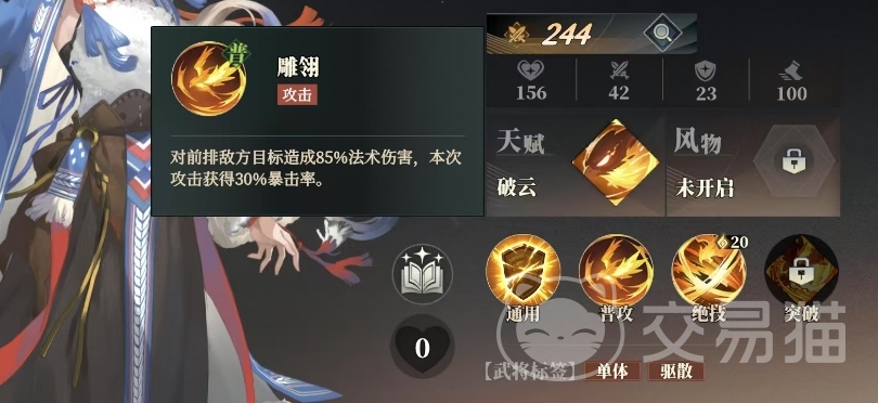 在游戏前期,大家手中的资源往往都比较有限,这时候要是获得了邹翊,直接上场让她参与战斗也未尝不可,凭借她独特的技能机制,还能在前期的战斗中打出亮眼的表现,邹翊的普攻名为雕翎,当她发起攻击时,便会直指前排的敌方目标,携带着85%的法术伤害,而且此次攻击还附带了30%的暴击率,也就是说,每一次普攻都有机会打出高额的伤害。