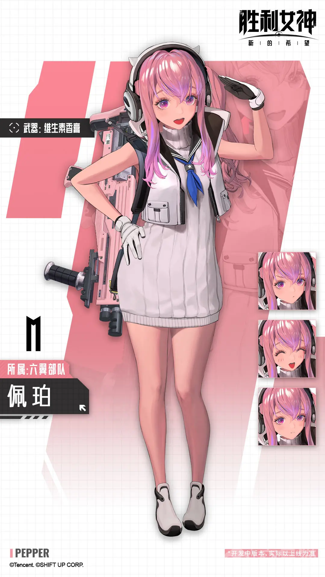 是游戏里一名SSR品质的奶妈辅助,她的奶量非常的可观,是实用性很高的治疗角色,能快速的拉起队友的血线,在战斗关键时刻,可以及时的回复队友生命值,保证队伍整体的生存和续航,其他队友也能更加安心的输出。普攻霰弹枪,可对目标打出攻击力231.6%的伤害。技能1”重生之心”,最后的子弹会命中体力最低的1个队友,让该队友回复2.63%的最大体力,如果最后的子弹命中了全体友方,技能让体力恢复量提高3.86%,可持续15秒,并叠加5次。
