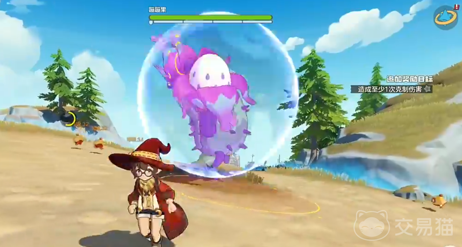 蹦蹦果在第一阶段挑战里同样只有一个技能,那就是本体跃起,砸向角色所在的方向,落点范围会有红色圆圈来标识,再加上敌人的速度比较慢,所以会有长达2秒的预警时间,大家在期间操纵角色离开预警范围,就可以躲避伤害用魔法攻击本体的护盾,攻击时需要注意蹦蹦果还有一个特殊机制,那就是会尝试修复自己的护盾,如果不想要这场战斗变成长久地拉锯战,建议在它修复的时候,立刻用星星魔法展开攻击,这样就能打断它的修复;