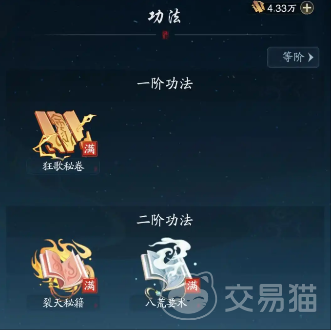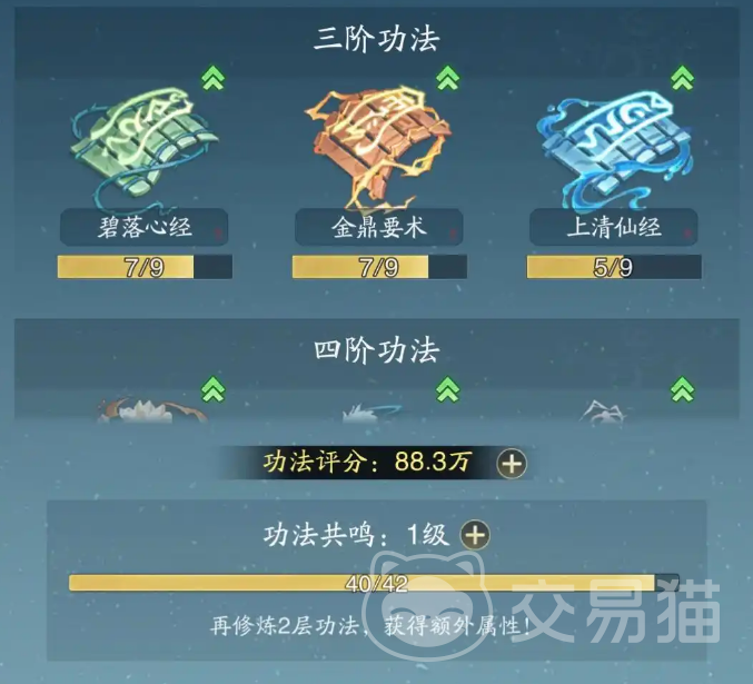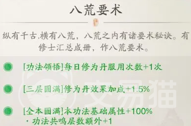 一阶功法“狂歌密卷”提升炼丹效果;二阶功法“裂天秘籍”行气次数+1和加成行气修为;二阶功法“八荒要术”修为丹的次数+1和加成修为丹效果加成;三阶功法“金鼎要术”增加云游修为。