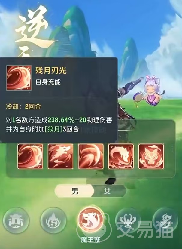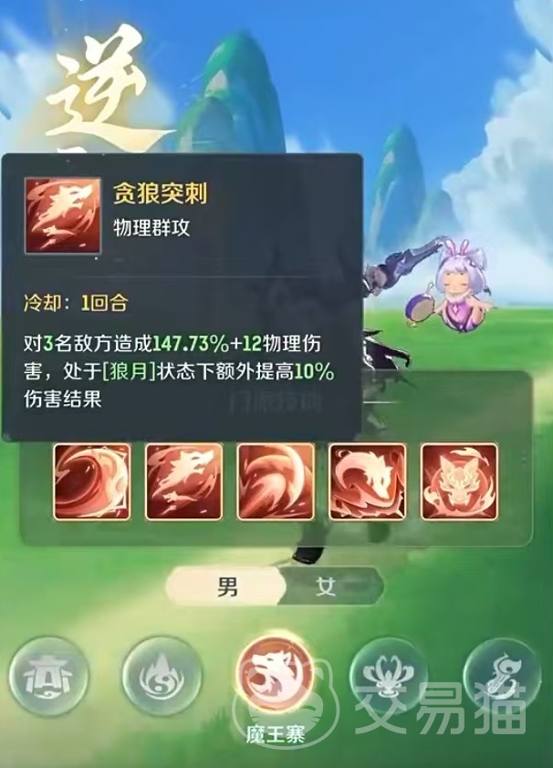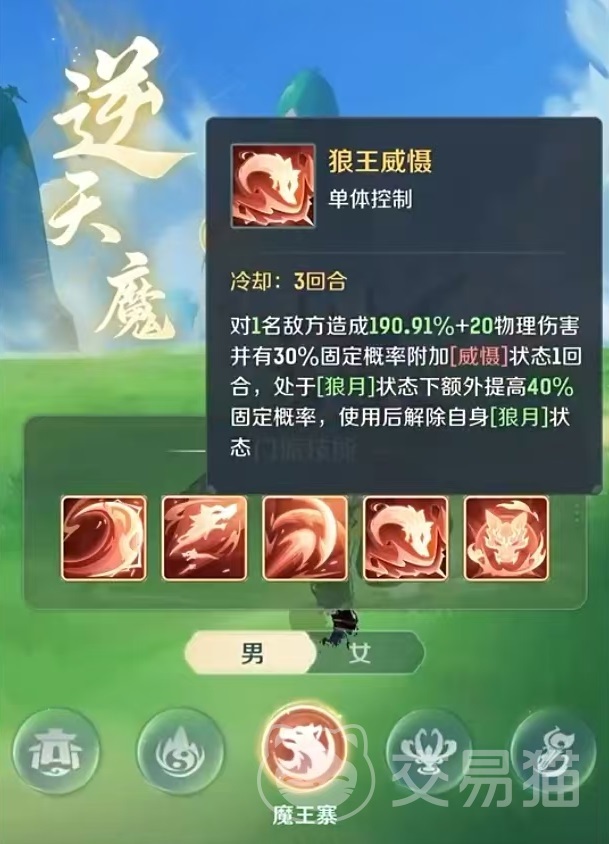 三技能平地铩影,属于多段爆发类型技能,冷却时间两个回合,对一名敌方目标造成两段物理伤害,如果处于狼月状态下,那么可以再额外打出一段等数值物理伤害。这也就是魔王寨三刀的来源。直接输出三刀伤害,如果能触发暴击,对方残血很难抵挡,而且使用完了三刀之后还不需要休息,只要有狼月状态就可以实现。四技能狼王威慑,单体控制类型,对一本名敌方目标造成物理伤害后,有30%固定几率附加威慑状态,持续一回合。