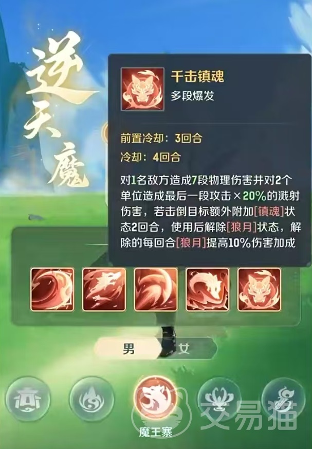 当处于狼月状态下时,额外提高40%固定概率,使用后自身的狼月状态会解除。五技能千击镇魂,也是属于多段爆发类型。需要前置三回合冷却,使用后四回合冷却,对一名敌方目标造成七段物理伤害,并对两个单位造成溅射伤害。如果能击倒目标,那么额外为其附加镇魂,使用后解除狼月状态。
