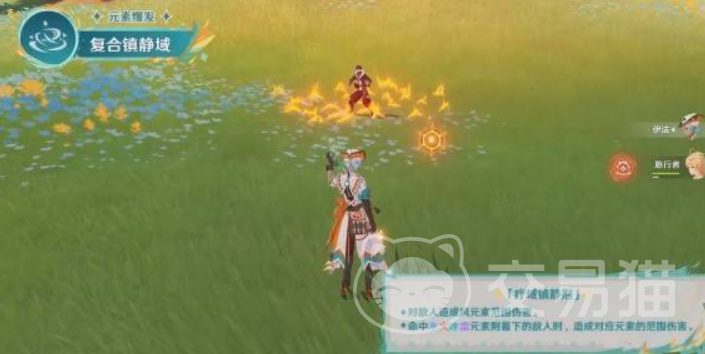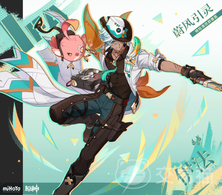 他的元素爆发,会发射出镇静剂,并用风场牵引束缚住里面的敌人,镇静剂会对被束缚的目标造成风元素范围输出,命中水、火、冰、雷元素附着下的目标时,还会造成一次对应元素的范围输出。