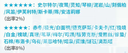 也就是说只要出6星就必定是大家自选好的,在此卡池中6星可选角色会有锏、左乐、涤火杰西卡、妮芙和焰影苇草,5星可选角色会有夜半、洛洛、波卜、温米、和弦和深律。