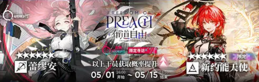 首先本次限定池的开启时间是从5月1日起到5月15日结束,池子中有蕾缪安、限定维什戴尔、限定塑心、限定缪尔赛思、聆音以及限定角色新约能天使,其中新约能天使是一位全新角色。