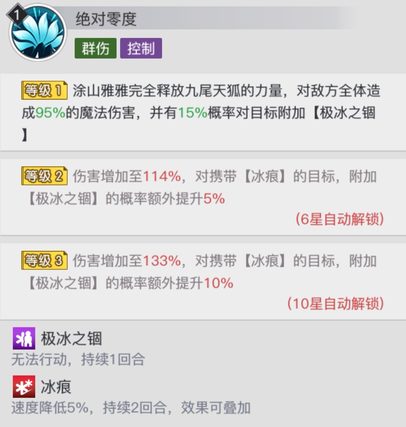 涂山雅雅的技能体系围绕冰系控制展开,她的核心技能无尽雅饮在战斗第一回合即可对敌方全体造成魔法伤害,并有概率附加冰痕效果,使目标速度降低,效果可持续2回合且可叠加,这一开局减速的能力能有效打乱敌方节奏,为我方争取先手优势。怒气技能绝对零度则是她的爆发手段,对全体敌人造成高额伤害,并有概率附加极冰之锢效果,直接冻结目标1回合行动。若目标已携带冰痕,冻结概率会大幅提升,形成减速冻结的连锁控制。被动技能极冰冻痕进一步强化普攻,让普通攻击也有概率附加冰痕,配合寒冰盛宴提供的自身属性增益,涂山雅雅在持续作战中能兼顾输出与控制。