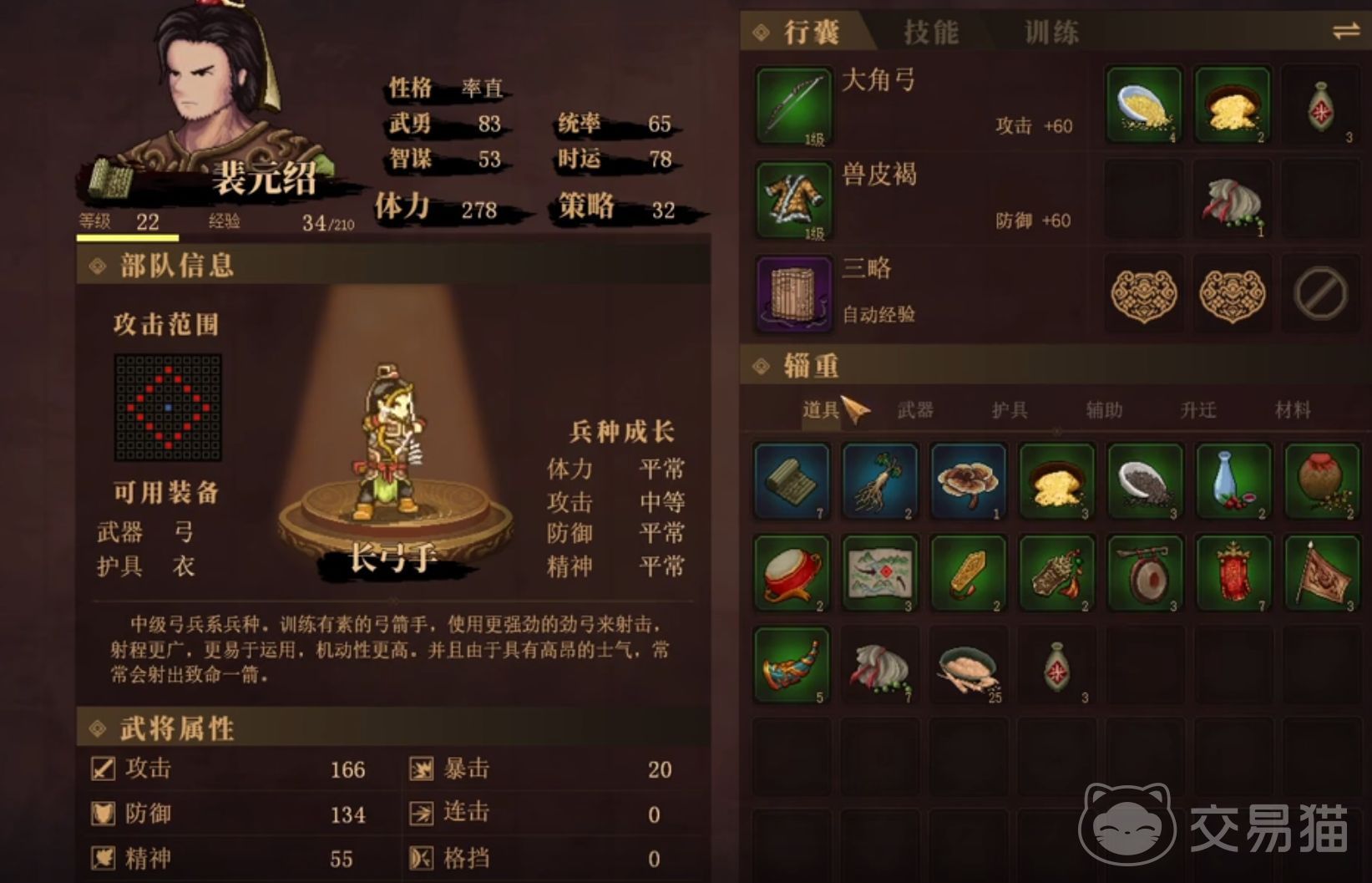 玩家在体验游戏时,如果想要合理的搭配裴元绍让他的战斗力提高到最大化,这时候玩家应该围绕他的弓兵特性进行,在武器方面直接选择长弓,能够有效的提升裴元绍的攻击力,还能够增加他的射程,让他在战场上更加安全的输出。