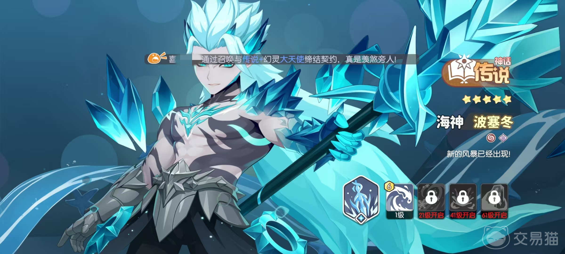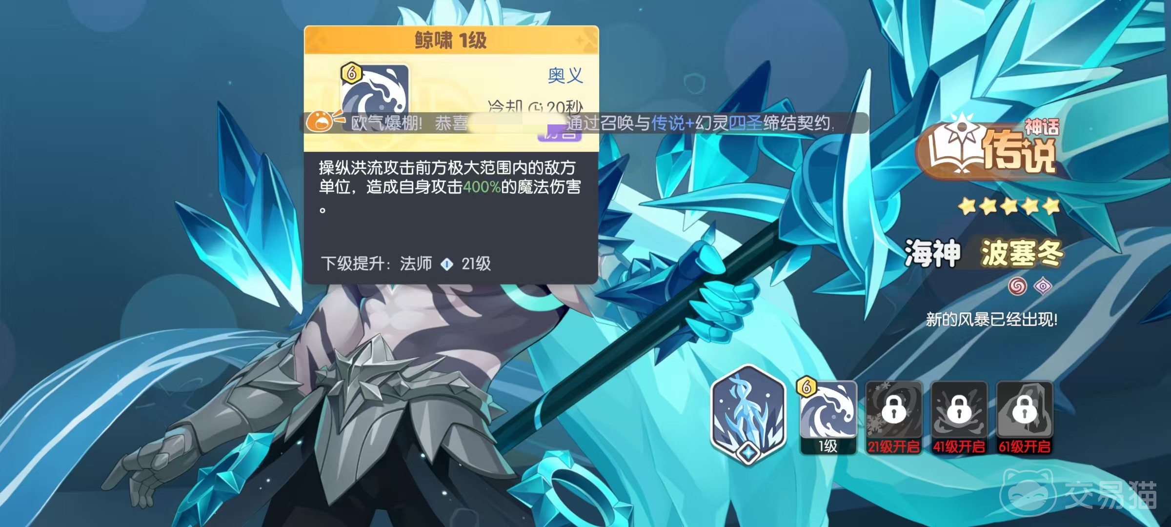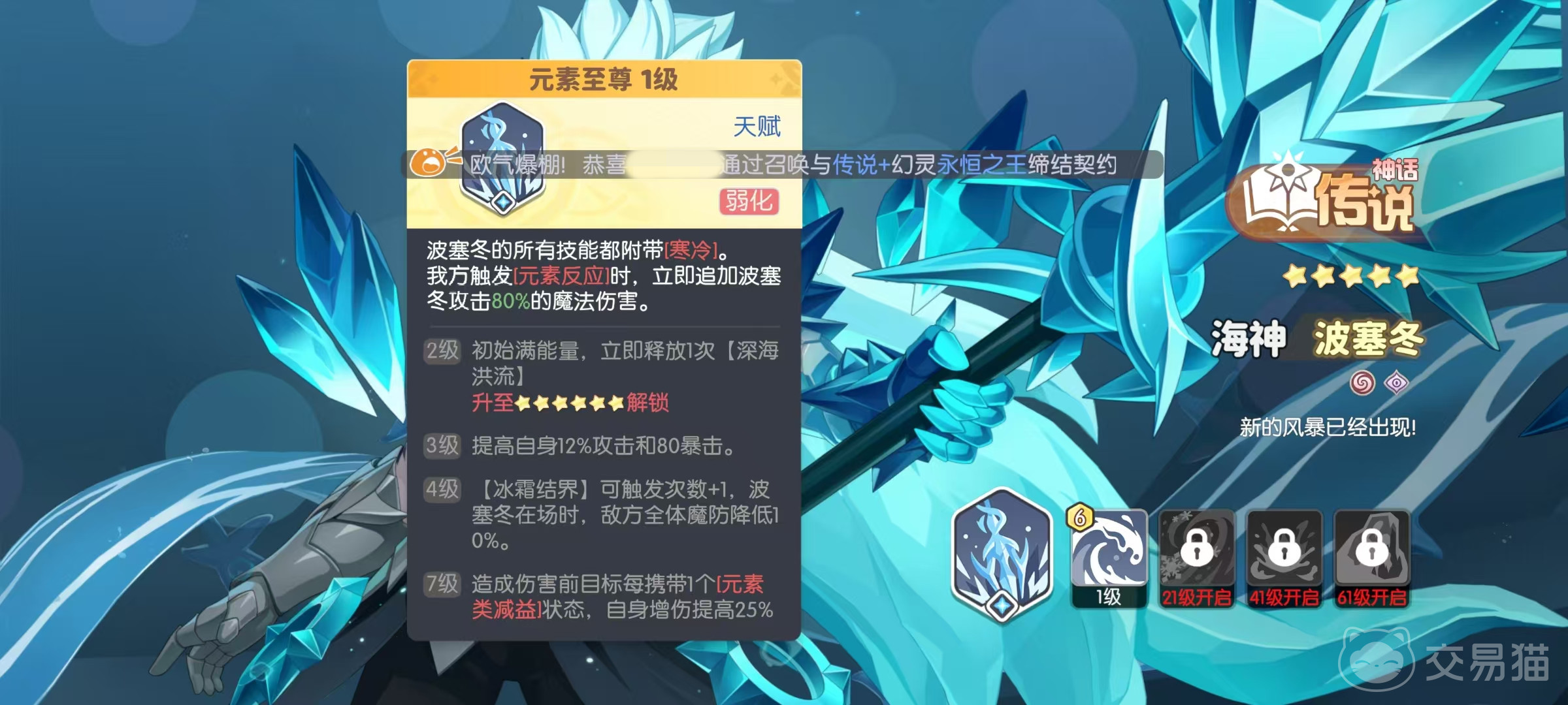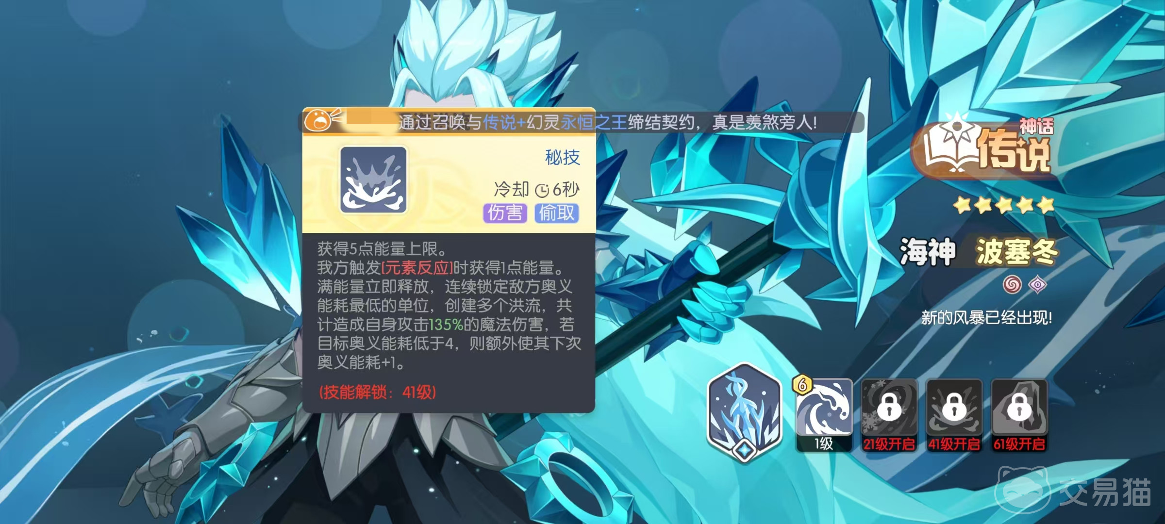 波塞冬的天赋效果是所有技能都会附带寒冷,寒冷是属于一种元素类减益状态,当触发元素反应时,会立即追加波塞冬80%攻击的魔法伤害。通过提高天赋等级,还能获得额外效果,例如提升提高自身攻击和暴击,冰霜结界的触发次数加1,波塞冬在场时,敌方全体魔防降低10%等。奥义技能鲸啸,操控洪流攻击前方大范围内的敌方单位,造成400%自身攻击力的魔法伤害。