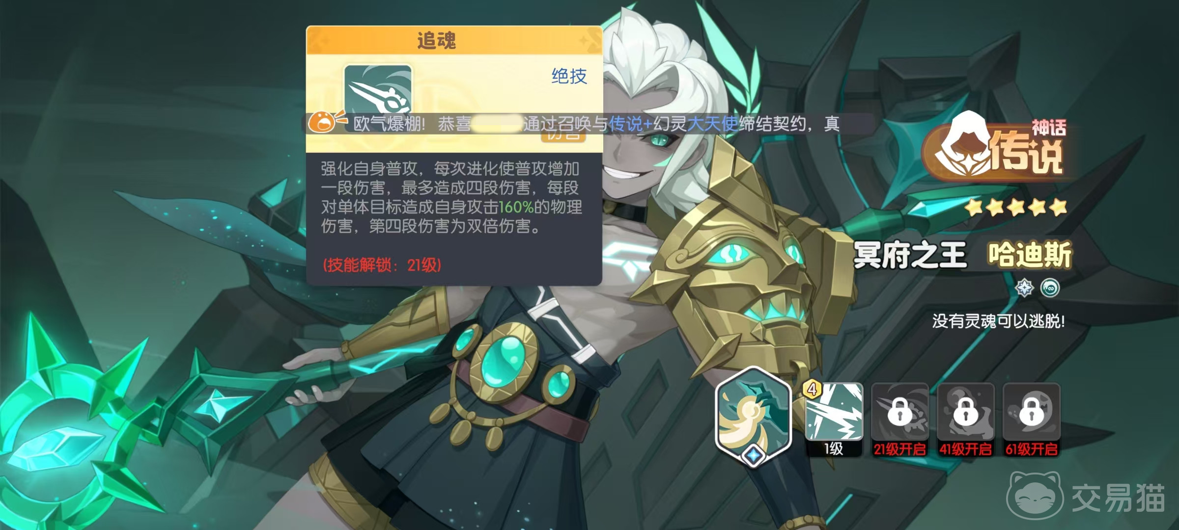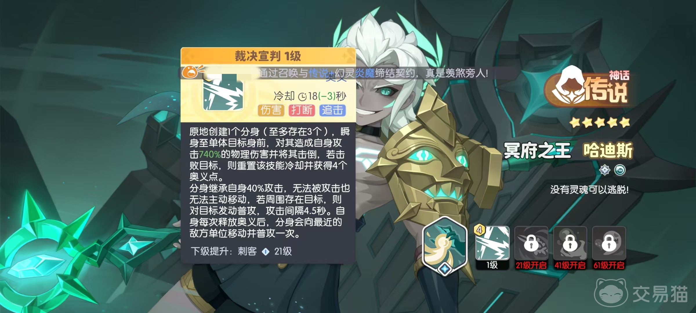 奥义技能裁决宣判,哈迪斯原地创建一个分身,瞬间至单体目标前,对其造成740%攻击力的物理伤害,并将其击倒。如果击败目标,该技能冷却时间重置,并获得4个奥义点数。分身最多存在3个,分身继承自身40%攻击,无法被攻击也无法主动移动,如果周围存在目标则自动发动攻击。绝技追魂,强化自身普攻,每次进化,后普攻都能增加一段伤害,最多达到四段伤害。秘技无情猎手,攻击时根据自身已经损失的生命值百分比提高伤害。特技极乐净土,每当我方单位被击败时,自身获得一层遗言,每层能提高1%攻击力。