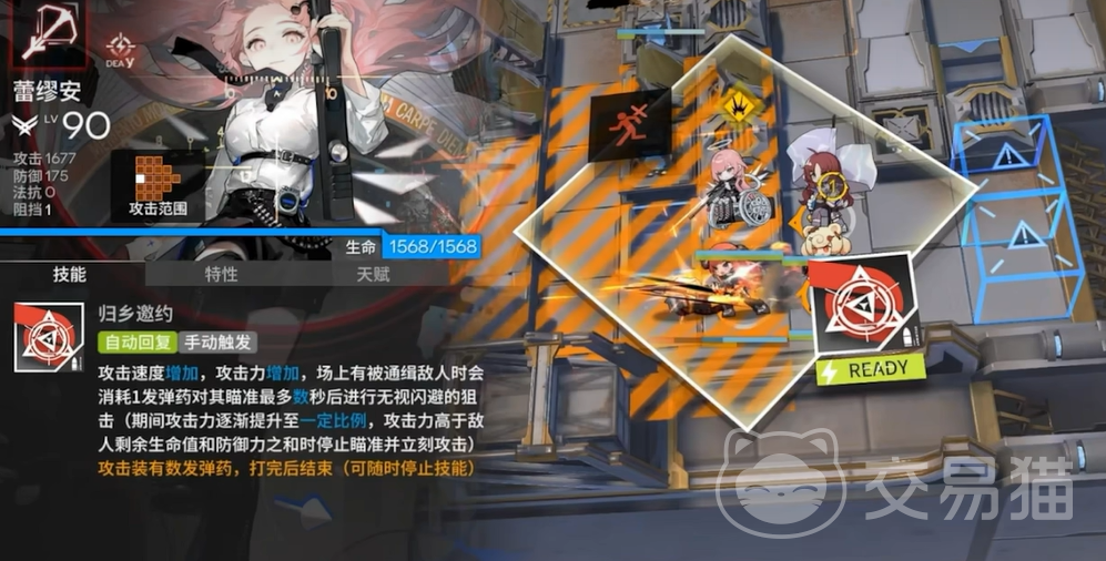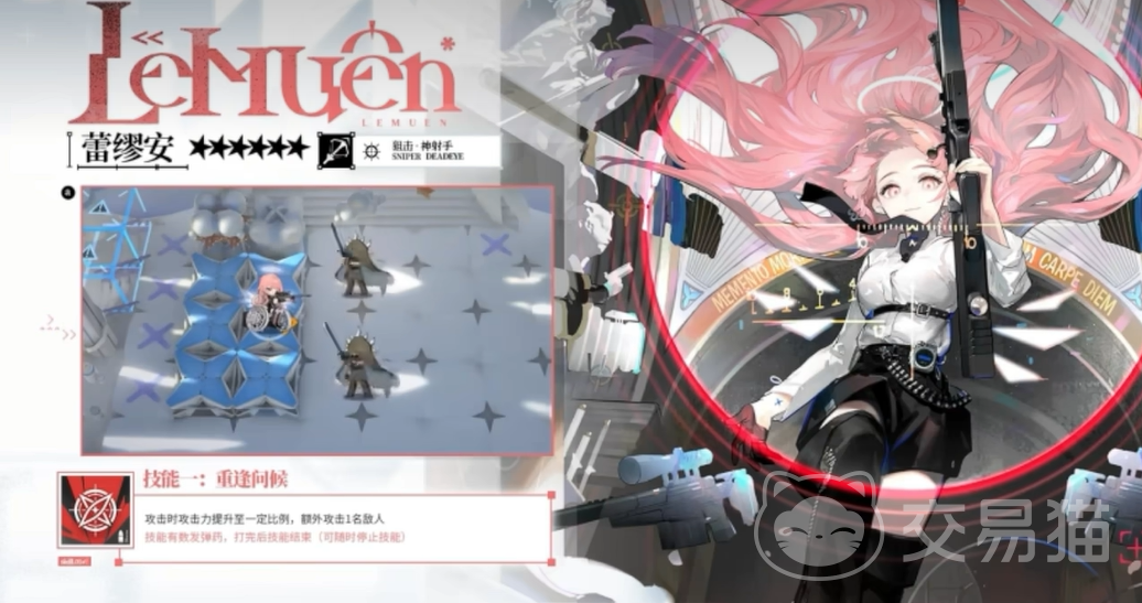 至于她的技能,蕾缪安展现出了她的多面性和战略性。第一技能“重逢问候”让她在攻击时增强自身的攻击力,并额外攻击一名敌人。这个技能不仅能提升她的输出,还能在关键时刻攻击到更多敌人,快速清理战场。而二技能“归乡邀约”则是她最具特色的技能之一。开启后,她的攻击速度和攻击力都能得到显著提升。更重要的是,如果场上有被通缉的敌人,她还会消耗弹药进行精准狙击,这一狙击可以无视敌人的闪避能力,并且攻击力会随着时间逐渐增强。想象一下,当敌人残血时,她的这一击可以直接决定战斗的胜负。