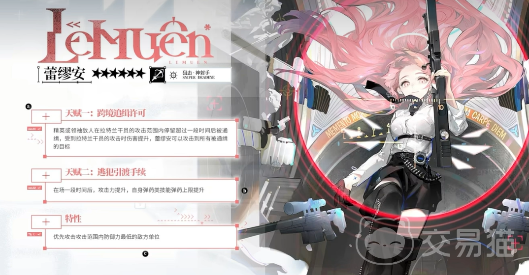 她的第一天赋“跨境追缉许可”是她的亮点之一。每当精英或领袖敌人进入她的攻击范围,并且在一定时间内停留,她就会将这些敌人标记为通缉目标。通缉目标的特点是什么?简单来说,就是它们会承受更高的伤害,并且蕾缪安可以随时攻击这些目标。这个设定让她的战斗节奏更加流畅,能够持续保持高压输出。而第二天赋“逃犯引渡手续”则提供了额外的增益。随着战斗的推进,蕾缪安的攻击力会逐渐提高,而且她的弹药上限也会得到增强,这让她的持续输出更加持久,面对长时间的战斗也不易感到疲软。