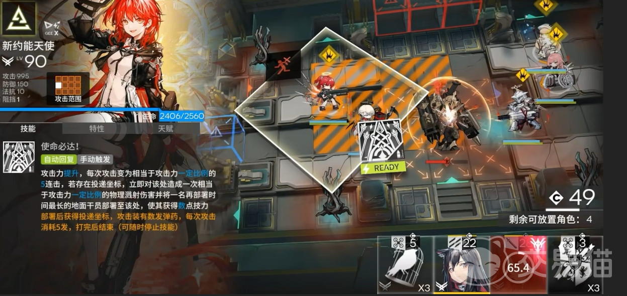 至于三技能“使命必达!”,这简直就是她的“爆发时刻”。能天使每次攻击变为5连击,且每次攻击后都能造成物理溅射伤害。更为特别的是,能天使可以在攻击时直接投递坐标,将队伍中的地面干员部署至指定位置,并为该干员提供技力。你不仅可以通过这个技能加强其他干员的战斗力,还能在合适的时机为他们提供战术支援。这项技能可以随时结束,并且具有高度的灵活性,使用时要注意掌握时机和弹药的分配。